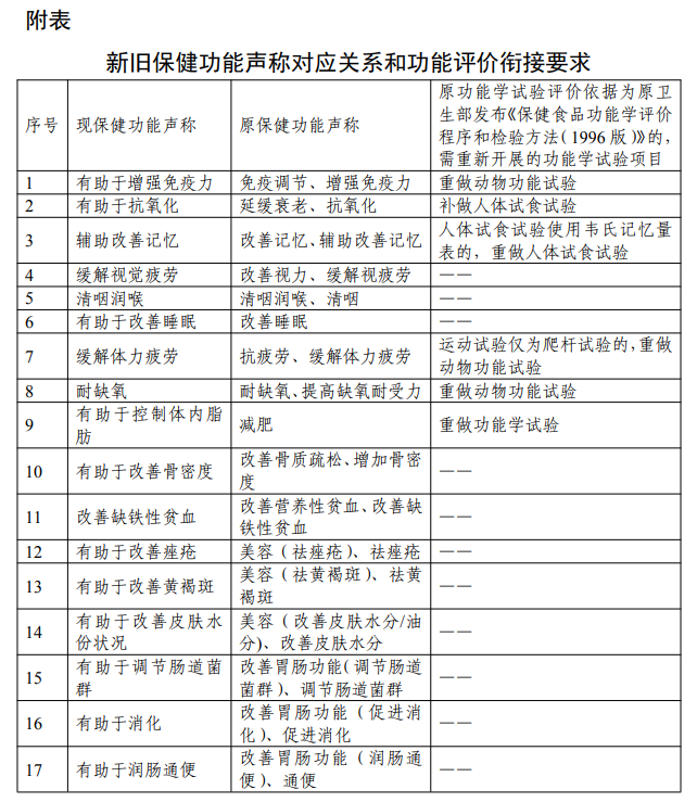 对保健功能已列入《功能目录非营养素补充剂(2023年版)》的产品,本公告发布之日起,设定5 年过渡期,规范注册和备案产品的保健功能声称,已发布的《保健食品原料目录》对应的功效按《功能目录 非营养素补充剂(2023 年版)》调整,并制定了《新旧保健功能声称对应关系和功能评价衔接要求》(详见附表)。其中,对于已备案产品,备案人向原备案机构申请变更保健功能名称;对于已批准注册产品,注册证书持有人可单独提出保健功能名称变更注册,也可在办理其他变更、延续注册等申请事项时转换原保健功能声称;对于在审产品,审评机构将直接调整保健功能声称及说明书相关内容,申请人无需补正。