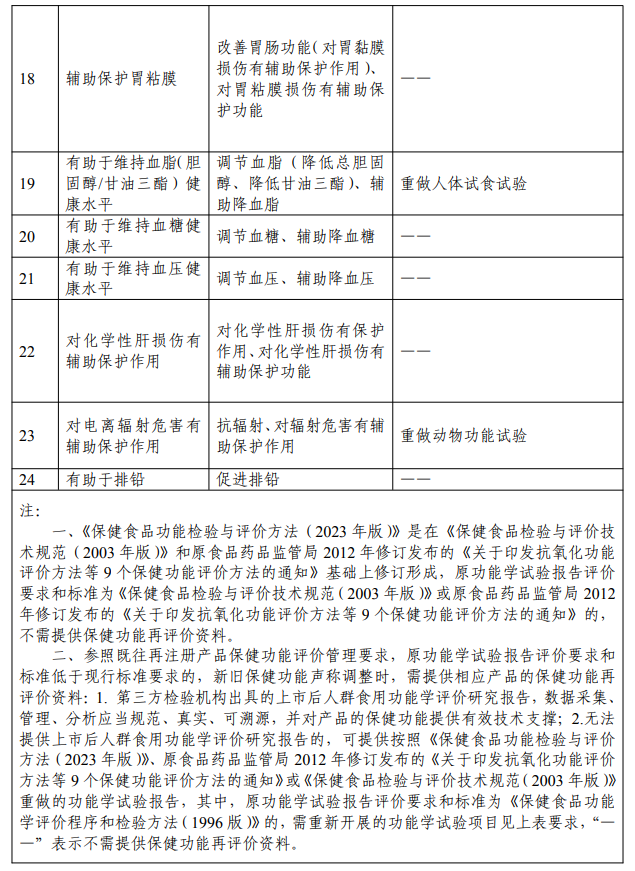 《保健食品功能检验与评价方法(2023 年版)》为《功能目录 非营养素补充剂(2023 年版)》配套的检验与评价方法,按照现有保健功能定位系统梳理 1995 年以来已批准注册的保健功能及配套评价方法,尤其是原卫生部发布的《保健食品检验与评价技术规范(2003 年版)》和原食品药品监管局2012 年修订发布的《关于印发抗氧化功能评价方法等9 个保健功能评价方法的通知》,围绕功能声称、评价方法等内容修订形成新版检验与评价方法,并由强制性方法改为推荐性方法。为落实企业研发主体责任,充分发挥社会资源科研优势,对于已纳入《功能目录非营养素补充剂(2023 年版)》的保健功能,任何个人、企业、科研机构和社会团体在科学研究论证的基础上,可以提出新的功能评价方法,参照功能目录的纳入程序,认可作为功能评价推荐性方法后,可供产品注册时使用。