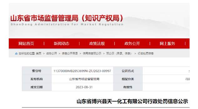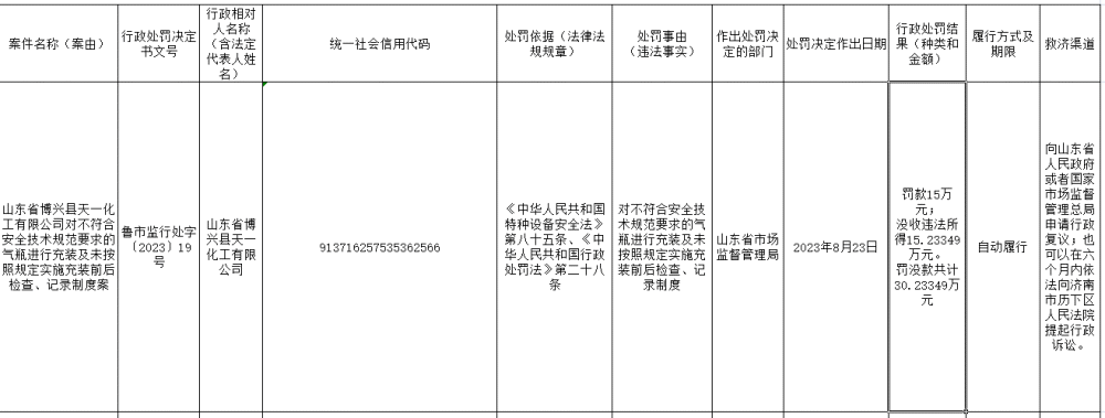 山东省市场监督管理局网站31日发布一则行政处罚信息。信息显示,山东省博兴县天一化工有限公司因对不符合安全技术规范要求的气瓶进行充装及未按照规定实施充装前后检查、记录制度,近日被山东省市场监督管理局依法作出罚款15万元、没收违法所得15.23349万元的行政处罚,罚没款共计30.23349万元。