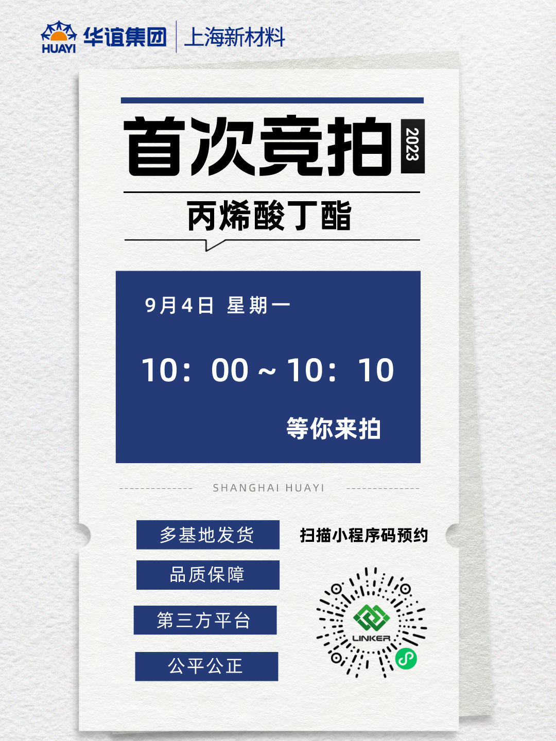 我司首次竞拍将于2023年9月4日上午举行,竞拍产品为丙烯酸丁酯。欢迎广大化工产品采购商积极参与我司竞拍活动,期待在竞拍平台上与各位客户和合作伙伴共同发展,共创美好明天!