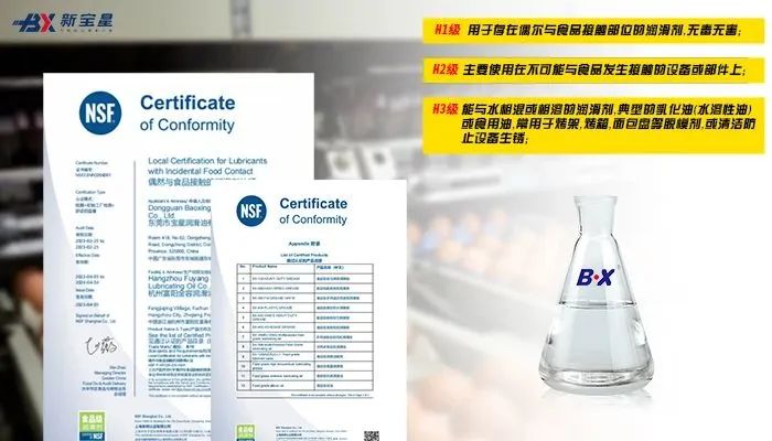 通常为“H1级、3H级”或“食品级”。这些润滑剂经过测试,可以在食品加工环境中使用而不会对食品安全造成风险。