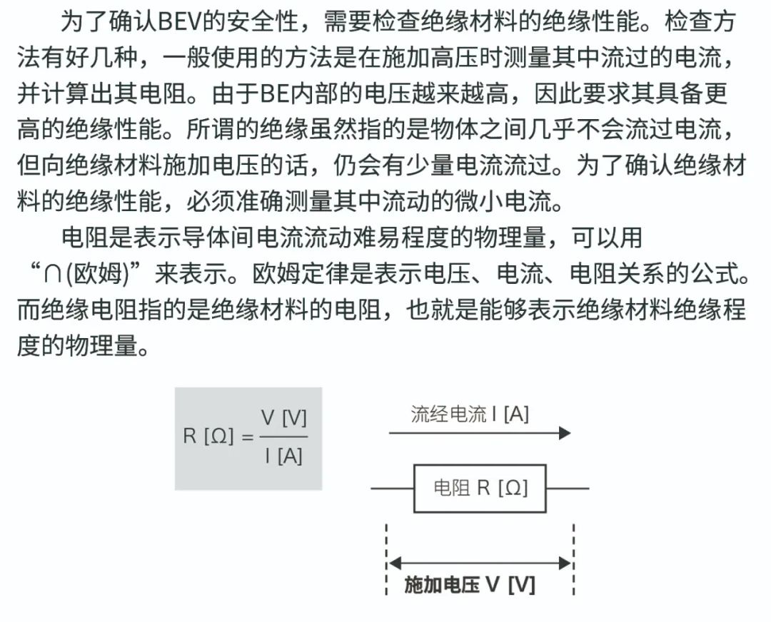 为了能够安全使用BEV,不导电的绝缘材料是不可或缺的,其绝缘性能非常重要。为了改善能源效率并缩短充电时间,BEV的高压化进程正在不断加快,而且对电压绝缘性能的要求也在不断提高。BEV除了需要大容量的电池和马达外,还需要用于电池充电的充电枪、以及用于调整驱动马达输出的动力控制单元(PCU)。这类零部件在运作时需要用到相较于以往汽车零部件更高的电压和更大的电流。例如,在广为人知的充电标准GB/T中,以交流220V/直流40OV以上的高压进行充电。充电者需手持充电枪将其插入BEV的充电口进行充电。因为人接触到高压会很危险,所以充电枪是用绝缘性能较高〈不导电的性能)的树脂制作的。为了安全起见,即使在BEV的内部,电池和PCU的周围都覆盖了绝缘材料。此外,马达是用缠绕着通电的线制作而成,线周围被一种叫清漆的绝缘材料所覆盖,这样保证了线圈之间的绝缘性。由于电动汽车中有很多地方使用了绝缘材料,因此绝缘材料的性能评估也越来越重要。