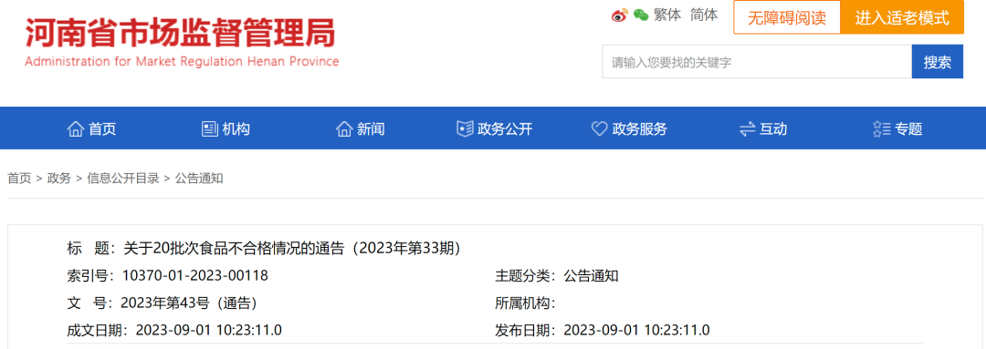 9月1日,河南省市场监督管理局发布了2023年第33期通告,检出不合格食品20批次,涉及微生物污染等。
