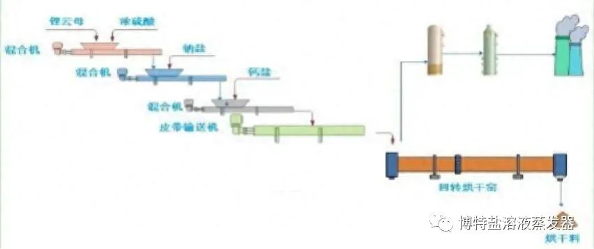 锂云母按照一定比例与硫酸、钾钠盐、钙盐混合均匀,混合采用一级混酸,二级混钠,三级混钙进行混合,锂云母混料烘干系统设备连接图