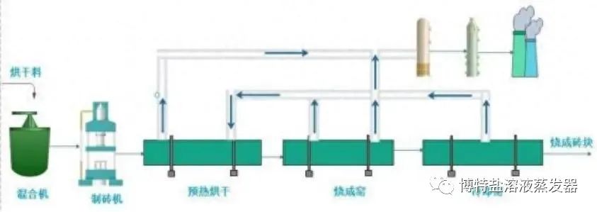 具体运行流程如下:回转烘干机产出物料经皮带输送至隧道窑成套装置。隧道窑成套装置包括行星混料机、制砖机、隧道窑(预热烘干窑、烧成窑、热量回收窑)、砖块破碎机及其他附属设备。隧道窑预热烘干热量来源于烧成窑烟气、产自冷却窑余热风,使砖块预热至140℃ ,砖块水分降低至3%。预热砖块通过进料小车输送至烧成窑,烧成窑内控制温度900~1000℃ 。烧成砖块进入冷却段后强制风冷,砖块冷却至150℃ ,焙烧后的冷却时间为 1.5小时,产生余热返回去隧道烘干窑。设备连接示意图