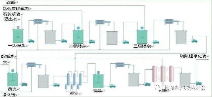 净化液中硫酸锂浓度较低,直接沉锂存在沉锂率低、体系流通量大、晶核生长周期长等问题,需在沉锂前蒸发浓缩至较高的浓度。蒸发冷凝水返回工艺调浆、净化渣洗涤、产品洗涤等。