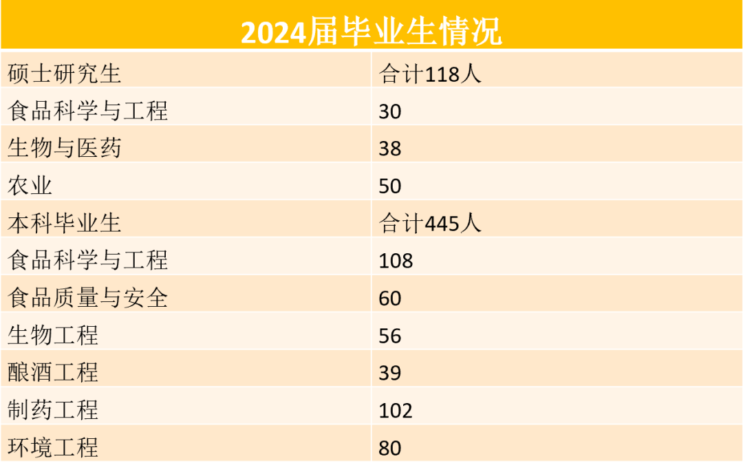 学院具有较为完善的本科、硕士人才培养体系。本科招收食品科学与工程专业、食品质量与安全、酿酒工程、生物工程、制药工程及环境工程6个专业。其中,食品科学与工程专业为国家级特色专业,生物工程及制药工程为省级特色专业,建有四川省食品科学与工程专业卓越工程师教育培养计划、制药工程专业卓越工程师教育培养计划、卓越农林人才教育培养计划基地,拥有食品科学与工程一级学科硕士点、农业领域食品加工与安全专业学位授权点、生物与医药专业学位硕士点。