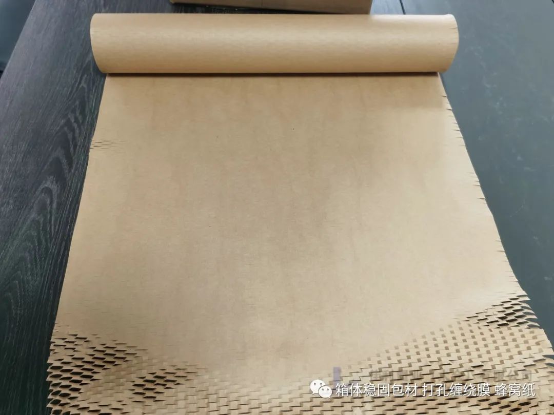 事先经过合适方法裁切的高拉力牛皮纸,经人工或拉纸机器拉伸展开后,呈蜂窝的形状,形成一个立体蜂窝衬垫。对包裹物起到很好的缓冲防震,防刮蹭效果。