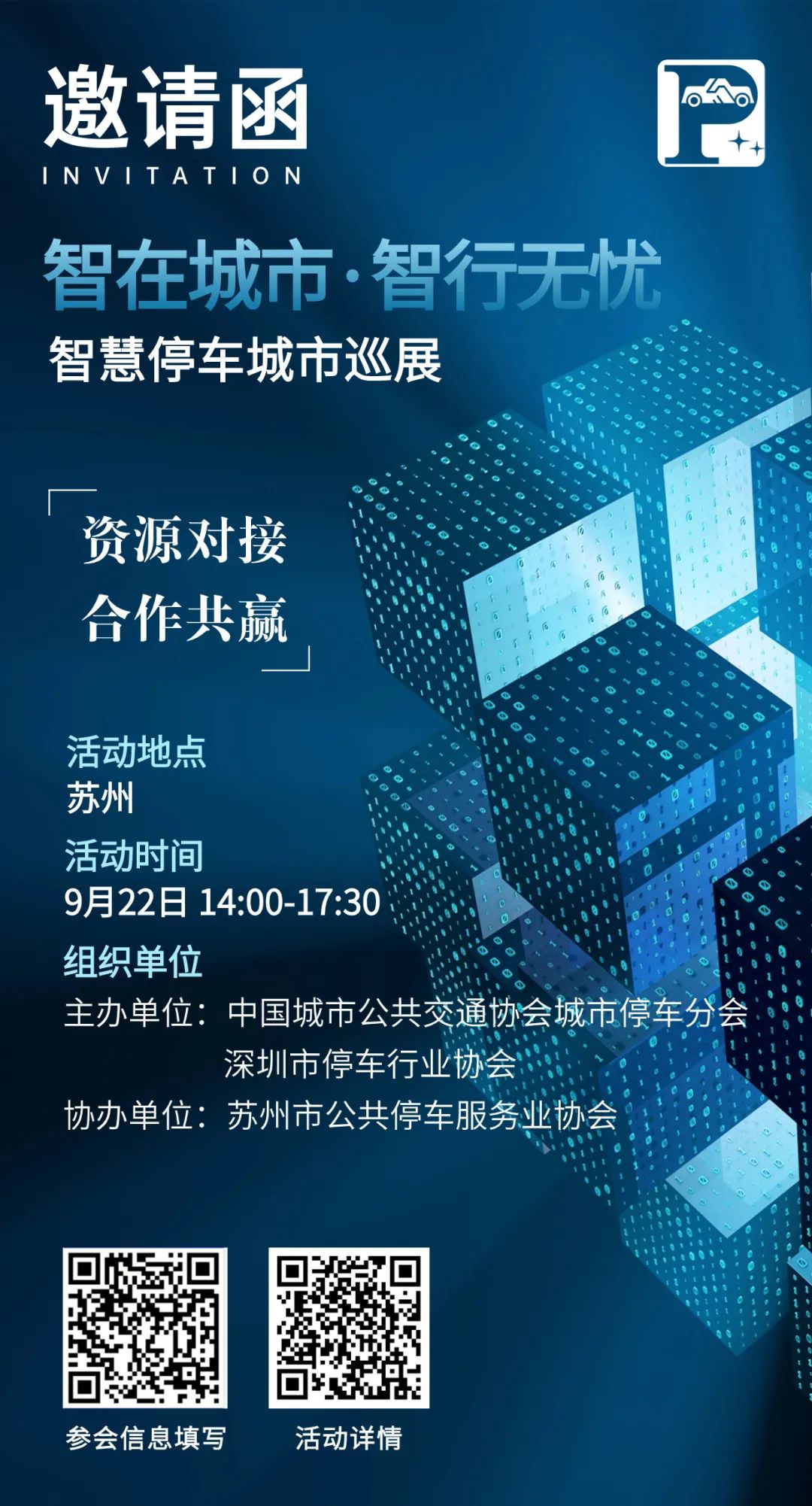 由中国城市公共交通协会城市停车分会、深圳市停车行业协会主办,苏州市公共停车服务业协会协办的“智在城市·智行无忧”智慧停车城市巡展—苏州站,将于9月22日盛大开幕,参展请扫描海报下方二维码。参展联系人: