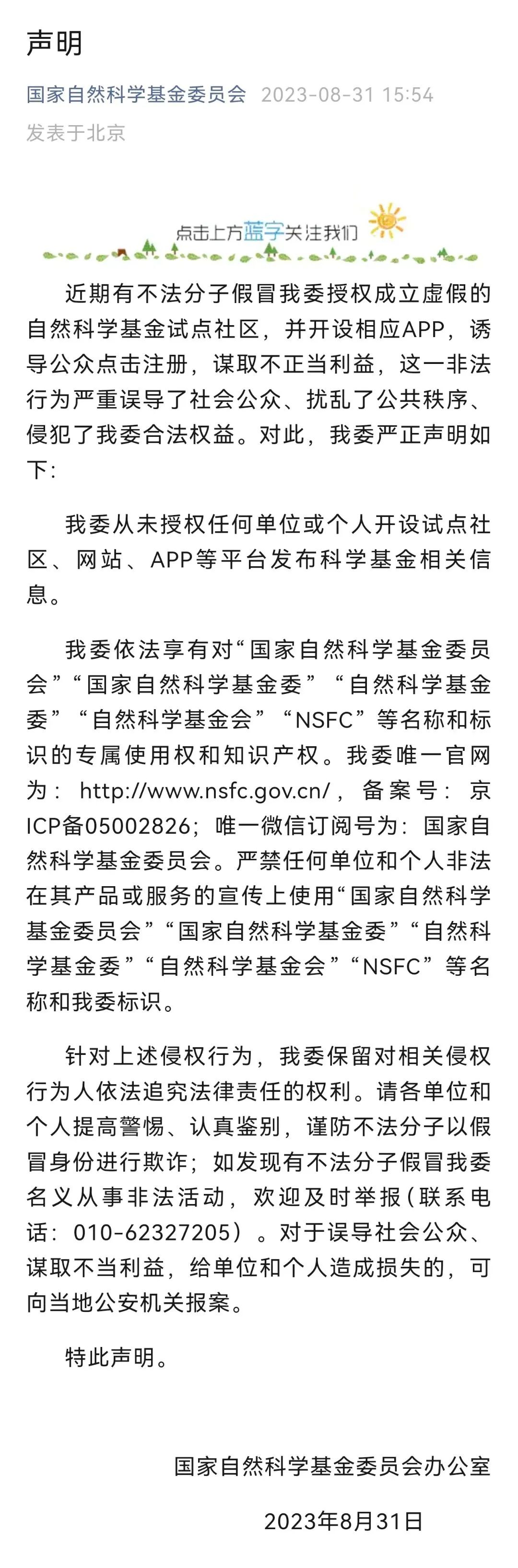 恰好当天就是通过专用APP“发放收益”的日子,民警迅速将该情况上报新干县公安局反诈中心,反诈中心经过综合研判分析判定:这就是电信诈骗的前期引流,加入的店主们则是骗子的目标群体,务必要及时退出。在张某创建的"自然科学基金新干社区QQ群"中,民警发现成员已发展到36人,其中有10余人是通过朋友邀请的方式进群。就在民警查看群内信息之际,该群还不时有店主上传带有海报的店内视频,打算以此来获取收益。民警当场要求张某、戈某在QQ群内发出公告,告知群内各位成员经过公安机关检查核实这个所谓的“国家自然基金”是一个诈骗陷阱,已经下载的“国家自然资金”APP务必要第一时间卸载、删除,确保不落入诈骗陷阱。在全体人员接收公告后,张某、戈某二人随即将该QQ群解散了。事后,民警对张某、戈某二人逐利、冒进,险将众多群众诱入诈骗陷阱的行为进行了严肃的批评教育。8月31日,就在事件得到圆满解决的第二天,国家自然科学基金委员会在其官方平台发布了一则声明,证实该事件所涉及“国家自然基金”APP为诈骗软件。来源:中国警察网