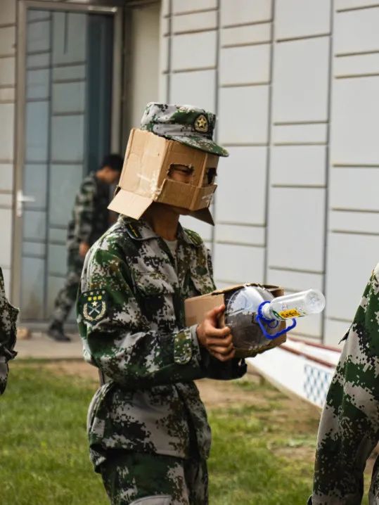 战术连的重要一课,自制单兵冷兵器。瞧,他们兵分两路,扮演起了不同的角色,有人“持刀伤人”,有人“正当防卫”,将硬纸板弯曲折叠,紧紧裹在晾衣杆上,还煞有其事地在刀刃上涂上了红色。严谨的他们还自制了面具,只留一双眼睛泛着“凶光”。