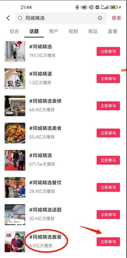 设置好之后打开我们抖音搜索,搜索同城精选,然后找到服装实体店相关的话题,点击立即参与,把你拍摄的视频上传上去就可以获得同城流量了。