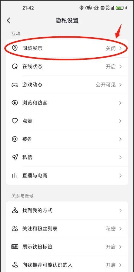 其实非常简单,打开主页,点击设置,这里有一个隐私设置,一定要把同城展示打开。