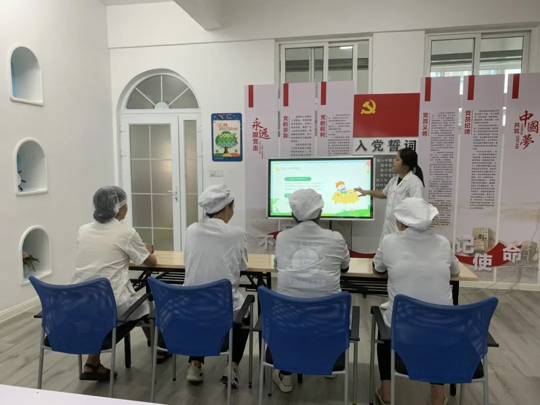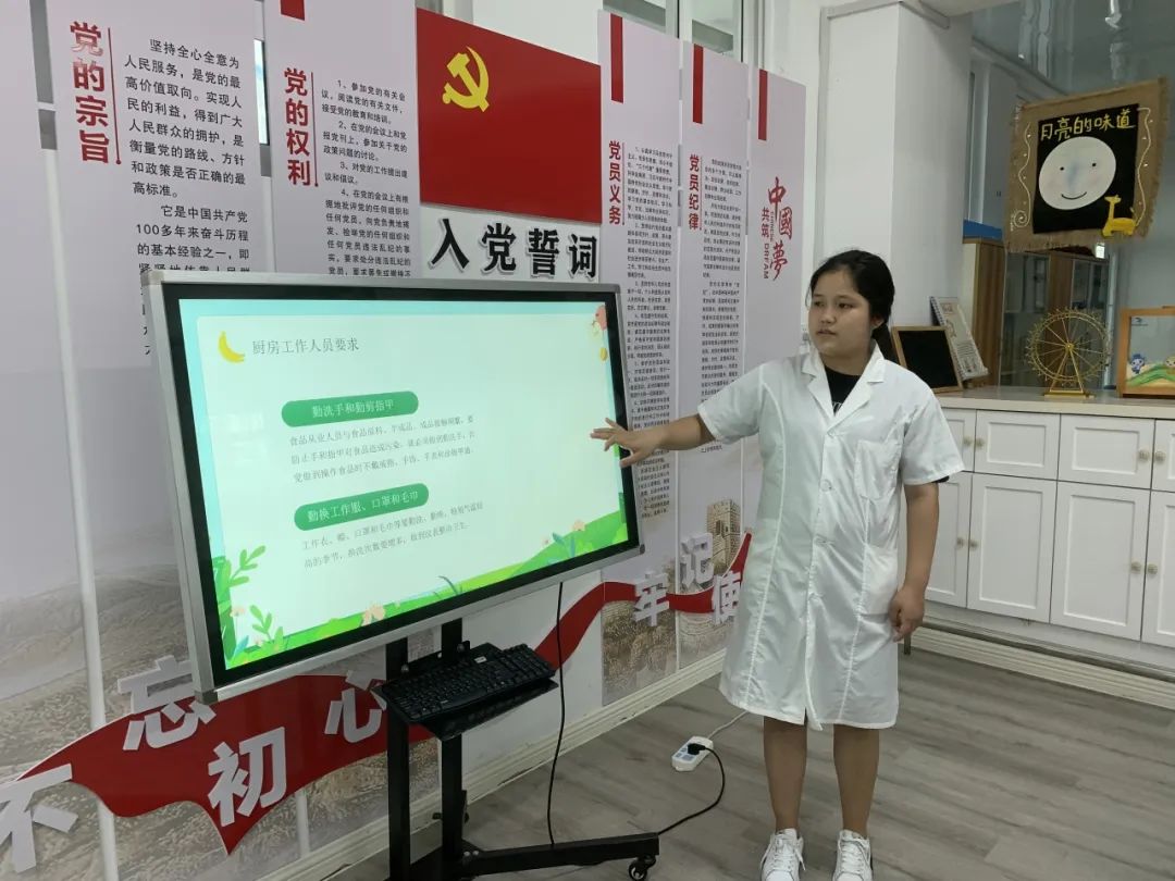 本次培训由保健医生张莹莹主持。会上,张医生结合《中华人民共和国食品安全法》、《餐饮服务食品安全操作规范》、《食品经营许可管理办法》等法律法规,重点对食堂从业人员,从厨房工作人员要求、食堂内外环境卫生、食物加工流程、幼儿园消毒制度等方面进行了培训。