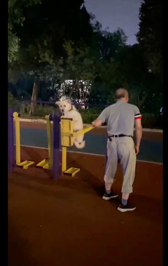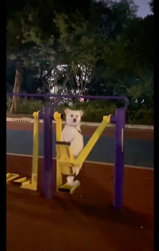 这一天网友在路过一处健身器材的时候,发现一只不知道是谁家的狗狗,此刻正坐在上面发呆呢!而这时候一位老爷爷,看到狗狗坐在上面后,突然奇想帮狗狗摇晃起来!就这样健身器材被摇得很高了,狗狗竟然还坐在上面没有下来!不得不说,这狗狗的平衡力还挺好的呀!