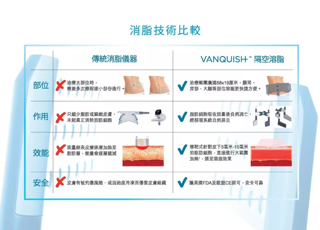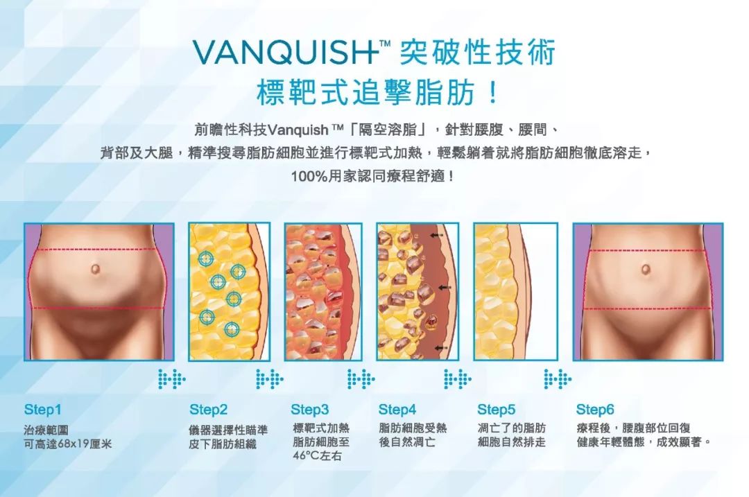 VANQUISH 「隔空溶脂」開創標靶式溶脂方案,針對性消滅脂肪細胞,而無損表層皮膚、肌肉和脂肪以外的組織。治療期間儀器更無需接觸身體,提供安全舒適、無痛高效的溶脂療程。