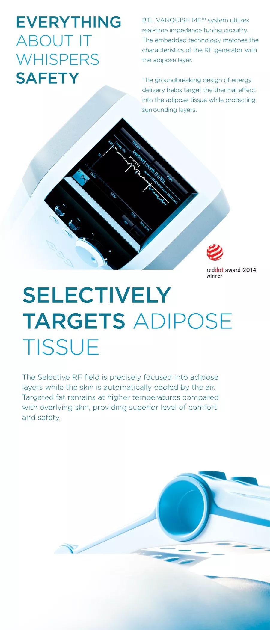 BTL VanquishTM獲美國FDA及歐盟CE雙重認可,共有14份的醫學報告,安全、有效、無痛、毋須觸碰、不用麻醉、無復元期是它的亮點。只須讓他們舒適地安坐或躺著休息,透過覆蓋範圍180o廣達 68cm X 19cm。臨床報告測試顯示,最高減幅可達13cm,成效絕對令人感到驚訝!VanquishTM獲美國FDA及歐盟CE雙重認可,共有14份的醫學報告,安全、有效、無痛、毋須觸碰、不用麻醉、無復元期是它的亮點。只須讓他們舒適地安坐或躺著休息,透過覆蓋範圍180o廣達 68cm X 19cm。臨床報告測試顯示,最高減幅可達13cm,成效絕對令人感到驚訝!