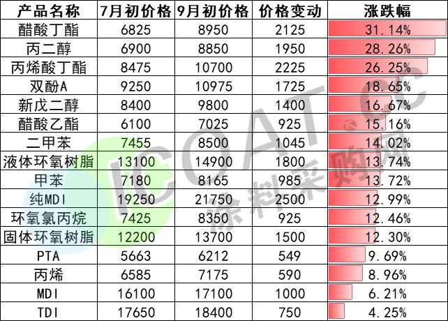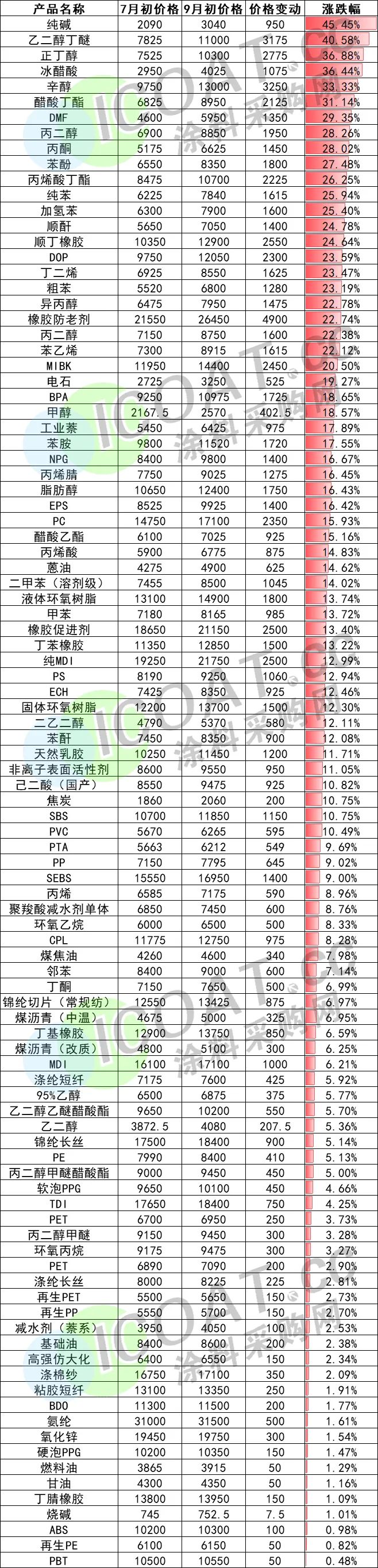 据涂料采购网了解,进入“金九”之后,90多种化工品报价较下半年7月初价格出现大幅上涨,部分化工品涨幅超过45%,吨价上涨最高约4900元/吨。纯碱目前报价3040元/吨,下半年以来价格上涨950元/吨,涨幅45.45%;乙二醇丁醚目前报价11000元/吨,下半年以来价格上涨3175元/吨,涨幅40.58%;正丁醇目前报价10300元/吨,下半年以来价格上涨2775元/吨,涨幅36.88%;辛醇目前报价13000元/吨,下半年以来价格上涨3250元/吨,涨幅33.33%;DMF目前报价5950元/吨,下半年以来价格上涨1350元/吨,涨幅29.35%;丙酮目前报价6625元/吨,下半年以来价格上涨1450元/吨,涨幅28.02%;苯酚目前报价8350元/吨,下半年以来价格上涨1800元/吨,涨幅27.48%;纯苯目前报价7840元/吨,下半年以来价格上涨1615元/吨,涨幅25.94%;加氢苯目前报价7900元/吨,下半年以来价格上涨1600元/吨,涨幅25.40%;顺酐目前报价7050元/吨,下半年以来价格上涨1400元/吨,涨幅24.78%;DOP目前报价12050元/吨,下半年以来价格上涨2300元/吨,涨幅23.59%;丁二烯目前报价8550元/吨,下半年以来价格上涨1625元/吨,涨幅23.47%;异丙醇目前报价7950元/吨,下半年以来价格上涨1475元/吨,涨幅22.78%;橡胶防老剂目前报价26450元/吨,下半年以来价格上涨4900元/吨,涨幅22.74%;MIBK目前报价14400元/吨,下半年以来价格上涨2450元/吨,涨幅20.50%。