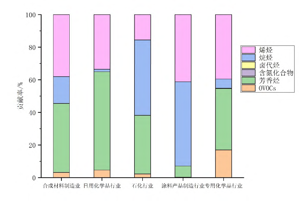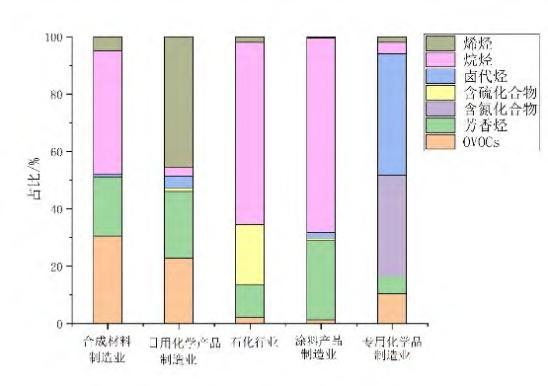 烷烃是合成材料制造业、石化行业和涂料产品制造业的主导VOCs 种类(占比分别为43%、63%和68%),烯烃是日用化学产品制造业的VOCs主要种类(46%),卤代烃在专用化学品制造业排放中占主导(43%)。