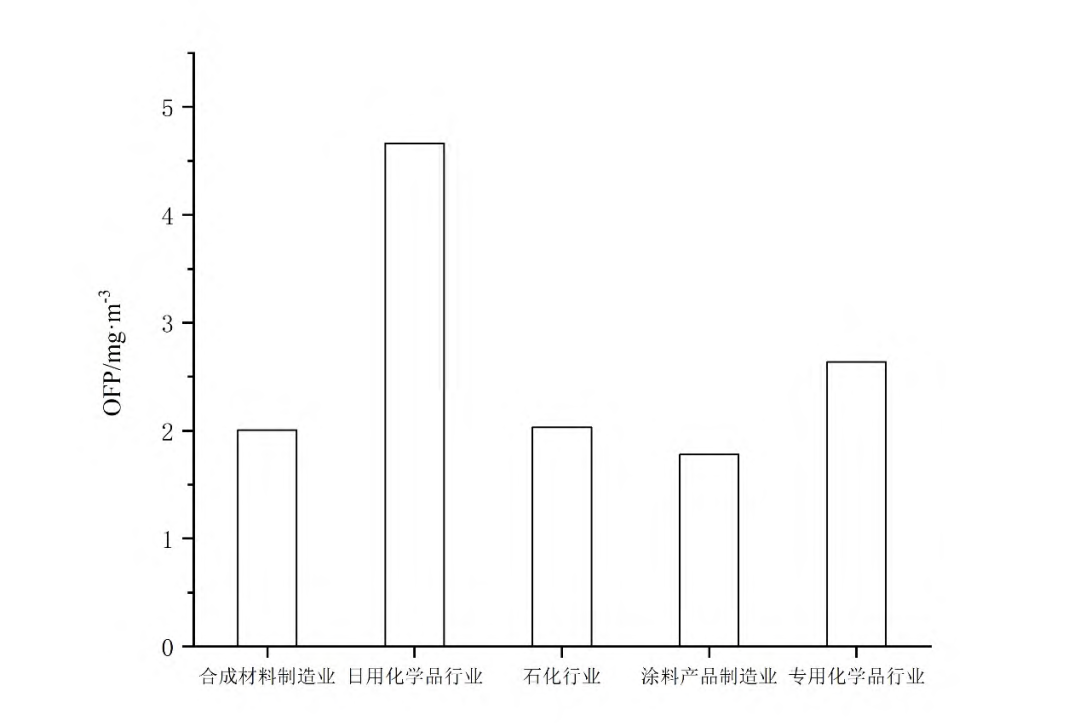 在单位浓度总VOCs 排放条件下,对臭氧生成潜势的贡献大小依次为日用化学产品制造业、专用化学品制造业、石化行业、合成材料制造业和涂料产品制造业。