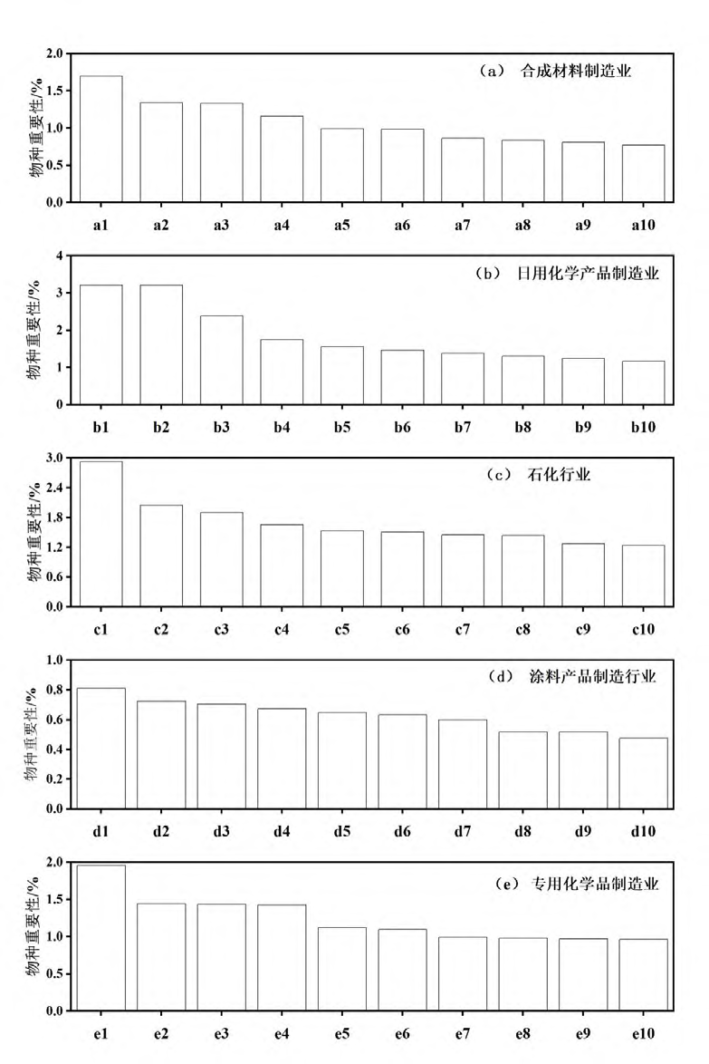 利用机器学习方法分析了上述行业的标识组分,发现癸烷和四氢呋喃是合成材料制造业源的特征标识组分,正丁醇和甲苯是日用化学产品制造业源的特征标识组分,1,2,3-三甲苯和1,3,5-三甲苯是石化行业源的特征标识组分,丙烯和3-甲基戊烷是涂料产品制造业的标识组分,对二甲苯和异丙苯是专用化学品制造业源的特征标识组分。