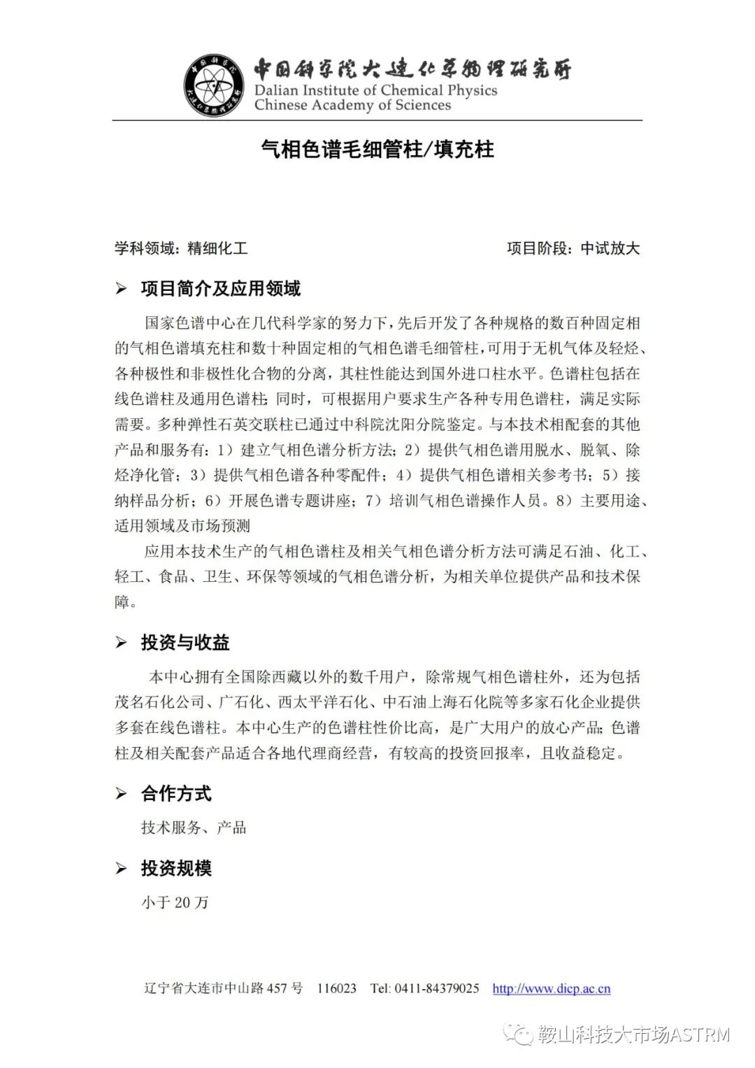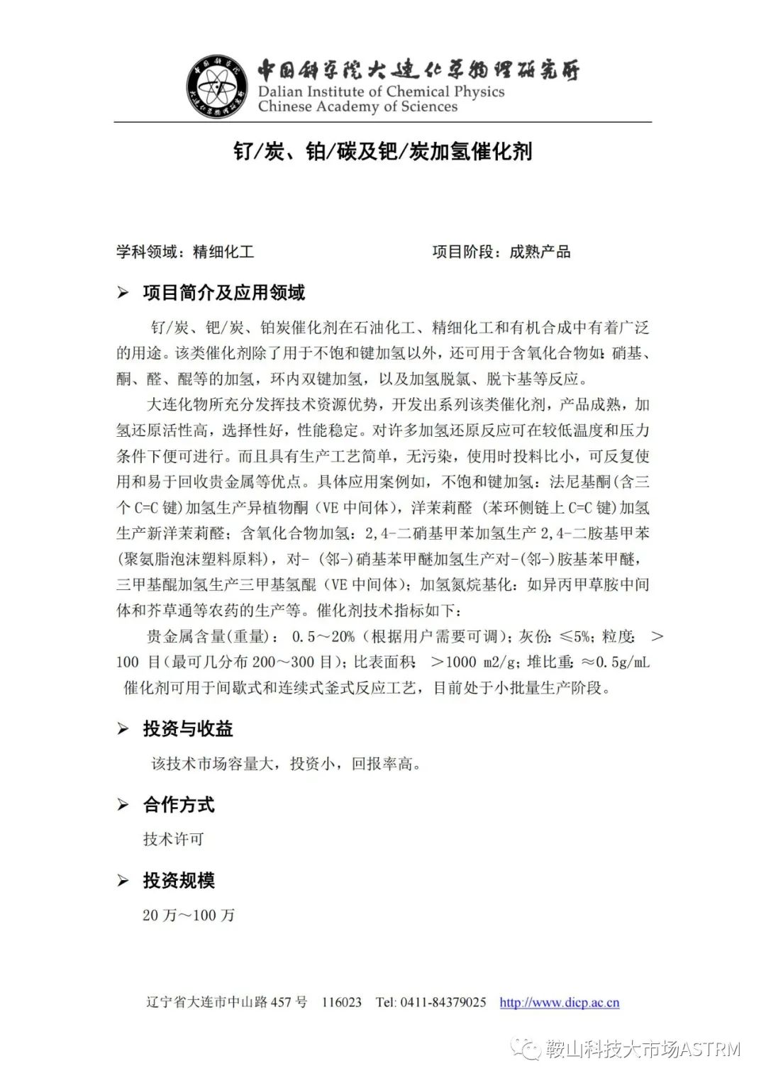 科技成果由中国科学院大连化学物理研究所提供,有需要的企业可拨打电话