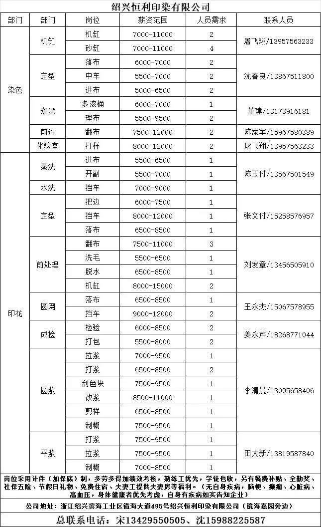1. 染色值缸 3名,18-50岁,做事踏实、肯吃苦,两班制。8000-20000元