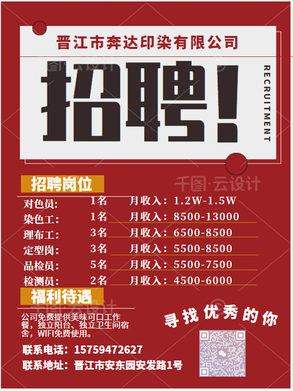 8/31 福建省晋江市经济开发区安东园区,福建省晋江市奔达印染有限公司诚聘: