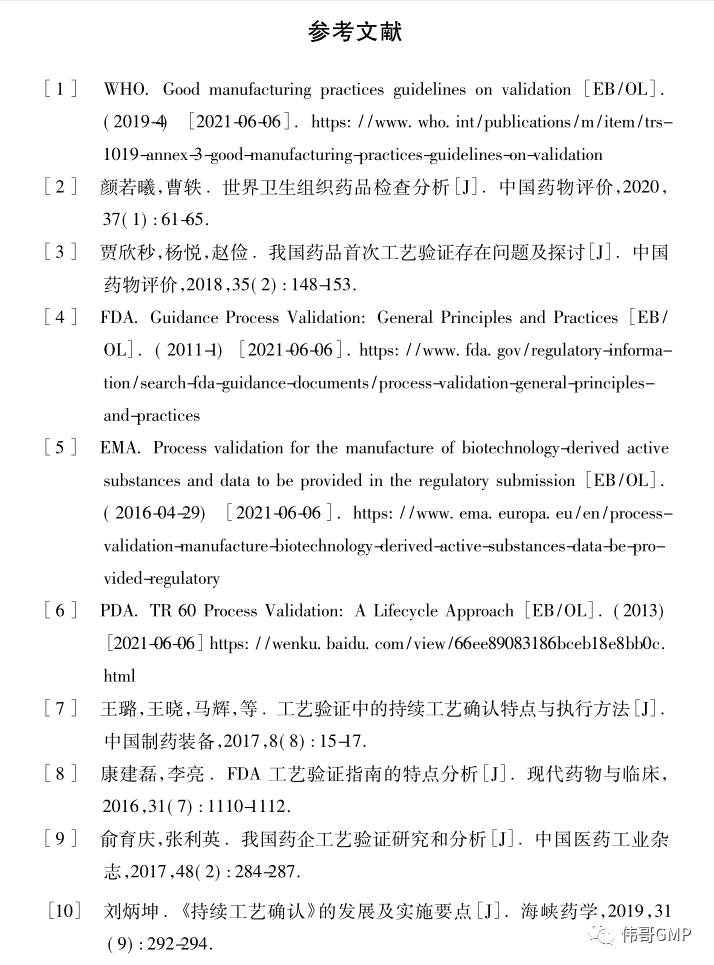 验证与确认工作是制药企业质量管理体系的重要组成部分之一。验证是证明任何操作规程或方法、生产工艺或系统能达到预期结果的一系列活动,适用于生产工艺、分析方法、清洁方法以及计算机化系统。工艺验证属于验证的一种,其需要遵循验证的基本要求,重点强调质量风险管理在其中的运用。工艺验证在全球各国或国际组织颁发的药品生产质量管理规范( 简称 GMP) 中均有明确的要求。如 WHO GMP 通则的第 4 节,WHO 确认与验证良好操作规范正文及附件 7,PIC/S GMP 基本原则的第 12 章,欧盟 GMP 基本要求的第 5 章及附录15,ICH Q7 的第 12 节,以及我国 2010 版 GMP 第 7章及确认与验证附录。此外,一些监管机构与国际组织还颁布了一些列工艺验证技术指南,如: 美国FDA“工艺验证指南一般原则与规范”[4]欧洲药品管理局“生物技术活性成分工艺验证和监管递交所需数据”[5]美国注射剂协会“工艺验证: 一种基于生命周期的方法”[6] 等。