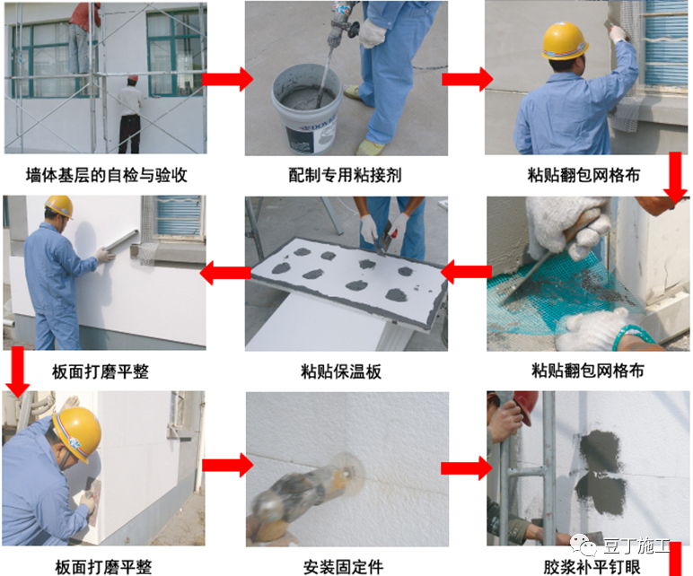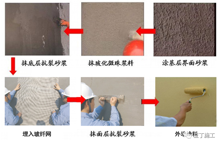 外墙等建筑围护结构的保温隔热性能是整个建筑物节能的关键,建筑墙体节能保温技术体系可分为以下三类:外墙自保温系统、外墙内保温系统、外墙外保温系统。外墙自保温系统是指按照一定的建筑构造,采用节能型墙体材料及配套专用砂浆使墙体热工性能等物理性能指标符合相应标准的建筑墙体保温隔热系统。优缺点:项目整体施工时效性高,价格相对较低,安全性能好,便于维修改造和可与建筑物同寿命等特点。但易产生热桥,内部易形成空气对流,节能效果不佳,材料自身导热系数浮动大,抗震性差等。外墙内保温系统是在墙体结构内侧覆盖一层保温材料,通过胶粘剂固定在墙体结构内侧,之后在保温材料外侧作保护层及饰面。优缺点:将保温材料复合在承重墙内侧,技术不复杂,施工简单,保温材料强度要求较低,技术性能要求比外墙外保温低,造价相对较低。但难以避免“热桥”的产生,墙体内表面易产生结露、潮湿、甚至发霉现象,防水和气密性差,不利于建筑物维护结构的保护,占用室内使用空间,内保温板出现裂缝比较普遍。外墙外保温系统是由保温层、抹面层、固定材料(胶粘剂、辅助固定件等)和饰面层构成,并固定在外墙外表面的非承重保温构造总称。优缺点:该技术体系适用范围广;保护主体结构延长建筑物寿命;基本消除了热桥的影响;使墙体潮湿情况得到改善;有利于室温保持稳定,改善室内热环境质量;有利于提高墙体防水和气密性;便于旧建筑物进行节能改造;可相对减少保温材料用量;不占用房屋的使用面积等。但保温层在墙体外侧,所处环境恶劣,对保温体系各材料要求较严格;材料要求配套及相容性好;对保温系统的耐候性和耐久性要求较高;施工难度大,要有素质较好的施工队伍和技术支持。在上述三种外墙保温技术体系中,我司较多采用外墙外保温技术,饰面材料以涂料、真石漆为主。本文主要介绍外墙外保温的施工工艺流程。(1)设计确认的施工图纸齐全,技术方案已通过施工单位、监理单位、建设单位审核同意。必要时联系厂家技术人员,对其产品施工工序、措施要求进行现场指导。(2)施工单位必须完成外墙外保温样板,并经设计、甲方工程部等签字确认质量、效果后,方可进行全面施工。(3)外保温工程施工前,应做好外保温工程的密封和防水构造设计,确保水不会渗入保温层及基层,重要部位应有详图。水平或倾斜的出挑部位以及延伸至地面以下的部位应做防水处理。在外墙外保温系统上安装的设备或管道应固定于基层上,并应做密封和防水设计。(4)除采用现浇混凝土外墙外保温系统外,外保温工程的施工应在基层施工质量验收合格后进行,保证墙面清洁、干燥、无松散的砂浆和杂物。 (5)除采用现浇混凝土外墙外保温系统外,外保温工程施工前,外门窗洞口应通过验收,洞口尺寸、位置应符合设计要求和质量要求,门窗框或辅框应安装完毕,伸出墙面的消防梯、水落管、各种进户管线和空调器等的预埋件、连接件、雨水管卡、支架应安装完毕,并按外保温系统厚度留出间隙,并做必要的防锈及防水处理。(6)外保温工程施工期间以及完工后24h内,基层及环境空气温度不应低于5℃。夏季应避免阳光爆晒。在5级以上大风天气和雨天时不得施工。