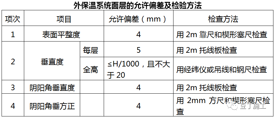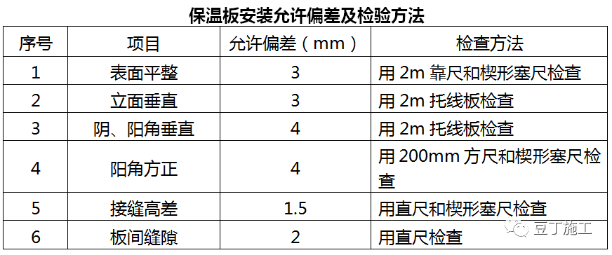 施工前由专职技术负责人进行书面的技术交底明确工艺做法、节点要求、质量标准。施工时严格按照施工方案和工艺标准进行,加强工序检验和过程验收。每一道工序完成后,均需组织进行验收,绝不将质量隐患带到下一施工工序。(1)进入现场的各种材料的品种与技术性能应符合设计和产品质量要求。(2)抹灰砂浆表面必须平整,玻纤网或钢丝网不得外露,防护层无空鼓或开裂现象,网格布与保温层紧密接触,无翘曲现象。(3)每道工序完成后,用2m平板靠尺检查各方向的平整度,用线坠尺检查垂直度,标准为抹灰层表面平整度允许偏差为4mm,立面垂直度允许偏差为4mm。(4)保温层的厚度偏差用针刺法检查,测定实际厚度是否符合设计要求。(5)随机抽样检查,每100㎡抽查一个点,若该点不符合设计要求,则增加抽样检查点为每30㎡设一点,并做好记录,统计并评定质量。(6)施工操作中的质量控制检查,由质量检查员组织进行,应控制施工质量的全过程,重点控制工序的质量,合格后方可进行下道工序施工。