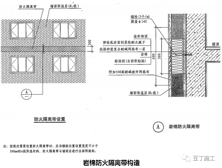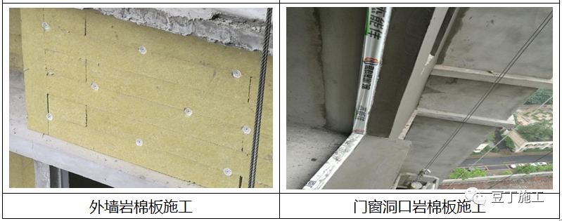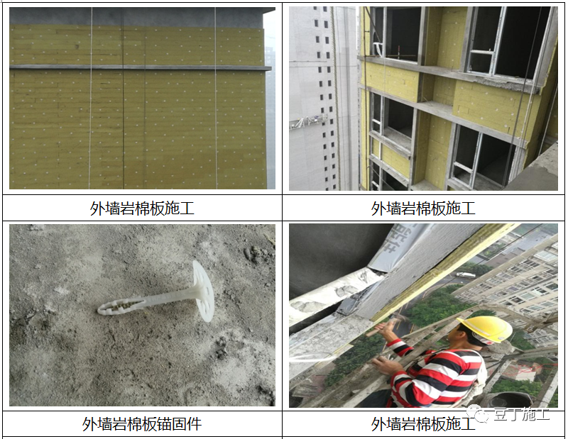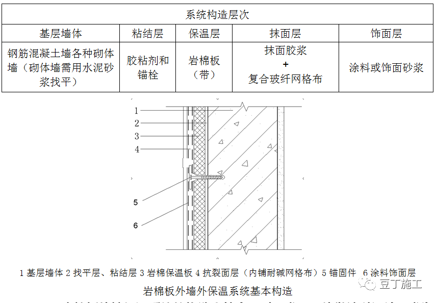 1.5.2岩棉板外墙保温系统的构造应符合下列要求(具体做法以设计要求为准):(2)岩棉板与基层墙体的连接应采用粘、钉结合工艺,其与基层墙体的粘贴面积不应小于岩棉板面积的50%(最小粘贴面积以满足各地区最低验收要求为准)。(3)岩棉板必须用锚栓固定,锚栓的用量应不小于6个/㎡。在高层受负风压较大的部位,宜增加到8~10个/㎡(锚栓的具体用量以满足各地区最低验收要求为准)。(4)锚栓中的金属螺钉应采用不锈钢钉或经过表面防腐处理的金属钉,塑料钉和带圆盘的塑料膨胀套管应采用聚酰胺、聚乙烯或聚丙烯制成,制作塑料钉和塑料套管的材料不得使用回收的再生材料。应根据不同基层墙体选择适用的锚栓,有效锚固长度应不小于30mm,使用于岩棉板时的塑料圆盘直径应不小于50mm,使用于岩棉带时的塑料圆盘直径不小于140mm。(5)岩棉外墙外保温系统的抹面层中均应内置玻纤网布。用于建筑物首层墙面的网布应由一层标准型网布和一层加强型网布组成;二层及以上墙面可采用一层标准型网布。(8)饰面层采用饰面砂浆时,应有底涂层;采用涂料时,抹面层表面应采用柔性耐水腻子找平。基层墙体应坚实平整,表面清洁,无油污、灰尘、脱膜剂等影响粘结的附着物,采用防水砂浆找平。墙体质量应符合《砌体结构工程施工质量验收规范》GB50203、《混凝土结构施工质量验收规范》GB50204的要求。胶粘剂应在现场制备,按胶粘剂干混料:水=1:0.25的质量比在砂浆搅拌机中(先加水后加料)搅拌3min~5min至均匀无块状,静置5min~10min后再搅拌一次即可使用,并应在2h内用完。搅拌好的胶粘剂应避免太阳直射;已凝结的胶粘剂不得再加水搅拌使用。(1)首次施工,在建筑外墙阳角、阴角及其它必要处挂垂直基准线,弹水平线,以控制岩棉板的垂直和平整度。(2)粘贴岩棉板前保温终端处用300mm宽耐碱网格布先行粘贴翻包网,其压入岩棉板和翻包尺寸均不少于100mm,将基层抹好的粘结砂浆上铺设裁好的耐碱网格布条,并用不锈钢抹子均匀压入胶粘剂内,让剩下部分网格布甩出待将来翻包用。(1)粘贴前,应先在散水坡以上不小于150mm部位用托架钉在基层墙体上安装铝合金底座托架,或托架离散水坡高度应适应建住结构沉降而不导致外墙外保温系统损坏的要求,并用底座托架连接片连接。勒脚部位的保温板宜采用高密度模塑聚苯板(大于30kg/m3),其高度可为300mm(半板)或600mm(整板)。(2)岩棉板的长度不宜大于1200mm,宽度不宜大于600mm。粘贴岩棉时,胶粘剂应涂在岩棉背面,在基层平整度小于5mm/2m时,优先使用条粘法进行粘贴,胶条应呈水平方向。条粘法:采用条宽12mm槽抹子,将胶粘剂均匀地涂抹在聚苯板上,以确保板的有效粘结面积符合要求。不得在板的侧面涂抹粘结砂浆。