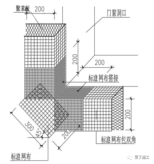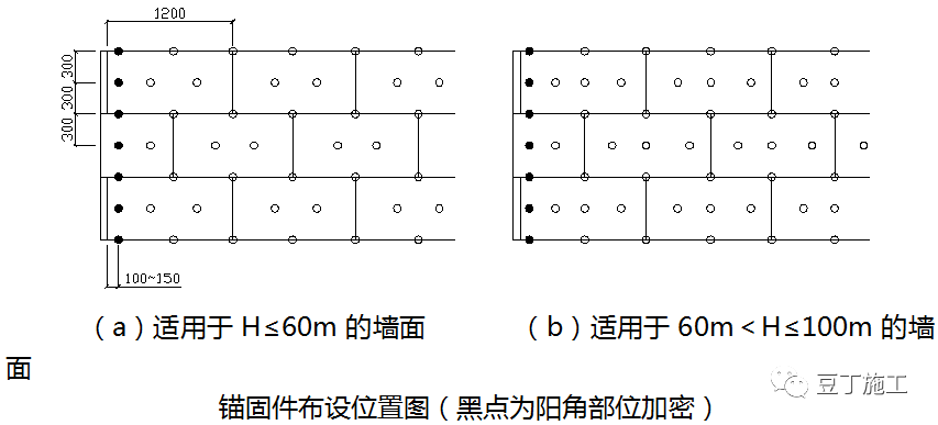 (1)岩棉板粘贴1d-2d后,可进行抹面防护层施工;在岩棉板上抹第一道抹面砂浆,厚度2mm-3mm,并趁湿压入耐碱网格布。(2)耐碱网格布的铺贴应平整、无褶皱,不得直接铺设在岩棉板表面,不得外露、干搭接;耐碱网格布搭接宽度应不小于100mm;在外门窗洞口四角按45度方向加贴300mm×400mm的耐碱网格布。(1)经停12h,待砂浆稍干硬至可触碰时安装第二批锚栓,第二批锚栓数量应为设计锚栓总数的70%,锚栓安装完成后进行第二道抹面砂浆施工,厚度2mm-3mm,抹面砂浆总厚度为4mm-6mm。(2)锚固件在墙面上的设置点数应满足:高度在60m以下的墙面每平方米不应少于5个,高度在60m以上且小于等于100m的墙面每平方米应接近7个。任何面积大于0.1㎡的单块板应设1个锚固件。外墙阳角、门窗洞口四周和檐口下均应按照下图进行加密设置,在距墙角100mm~150mm内的位置已有锚固件的中间均加设1个。
