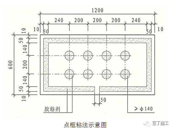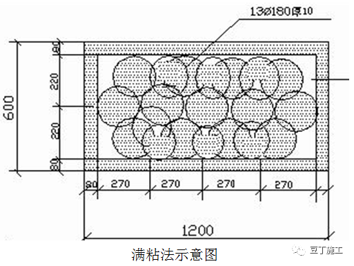 满粘法:保温粘结面积不低于保温板面积的95%。在保温板面四周涂抹一圈胶粘剂宽80㎜;侧面留50㎜宽排气口,板心按梅花形设粘结点,间距100-150㎜,直径180㎜。