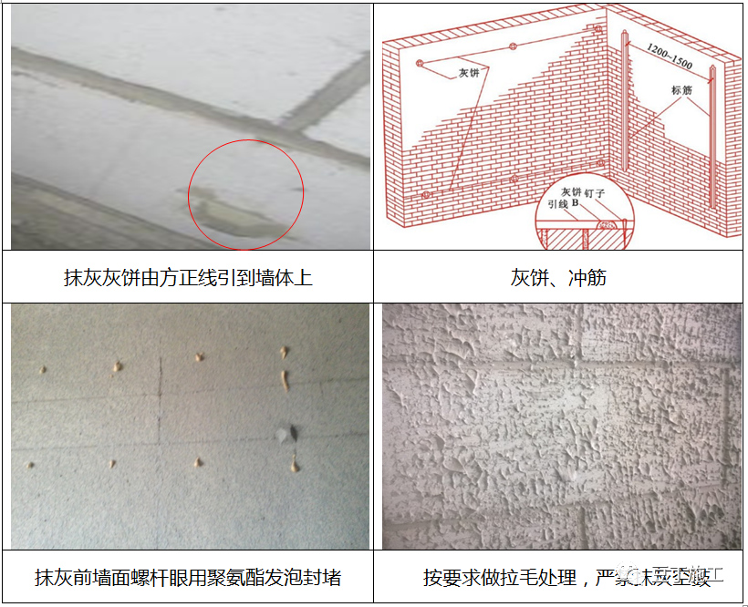 (1)基层找平处理是保温工程的基础,是整个外墙施工中很重要的一个环节。基层处理的好坏直接影响到保温层的附着力、平整度进而影响外墙装饰性和使用寿命。基层处理是指按设计要求采用水泥砂浆找平;找平层应与墙体粘结牢固,表面强度达到设计要求,表面干燥、平整,不得有脱层、空鼓、裂缝、粉化、起皮、爆灰等异常现象.具体做法如下:1)清理附着在混凝土墙面的油污、脱模剂及未完全脱落的混凝土养护液。剔除结构表面的旧模板等杂物,使喷浆层能有效牢固附着于混凝土表面,对于混凝土表面胀模的部分剔凿平整并且清理干净。抹灰前墙面螺杆眼应首先将孔内垃圾清理后,用聚氨酯发泡封堵并验收完毕。2)弹出室外方正控制线,并对控制线进行验收,验收合格后根据控制线打灰饼:从顶层开始用大线坠吊垂直,以四周大角为基线控制,绑铁丝找规矩,横向水平线依据楼层标高或施工+50cm线为水平基准线进行交圈控制,然后按抹灰操作层抹灰饼,做灰饼时应注意横竖交圈,以便操作。每层抹灰时则以灰饼做基准冲筋,在墙面上弹出抹灰灰层控制线,使其保证横平竖直。3)不同材料交接处、预埋管线开槽处,挂热镀锌钢丝加强网防止开裂,搭接宽度不小于100mm,并组织隐蔽验收。4)做好混凝土、砌块墙面界面处理:采用甩浆、喷浆法、刷专用界面处理剂等方法对外墙面进行界面处理,(注:甩浆、喷浆法具体操作可参考附件《墙面抹灰工程甩(喷)浆工艺做法指引》做法),界面处理完成24小时以后,进行喷雾养护,喷雾程度应保持墙面完全湿润,喷雾养护不应少于3天,每天2~3次,干燥、高温及大风季节每天应增加1~2次。5)甩浆表面应均匀、平整;不得出现直径大于20mm的空白底斑;界面浆点突出高度不小于5mm;喷浆点施工界面浆点高度应为4-8mm,圆点底部直径为10-15mm;形成圆点或网状形式均匀覆盖结构基层,控制浆点最大高差宜小于3mm,甩(喷)浆浆料平均覆盖施工界面应大于95%;成型且养护完毕的喷浆颗粒应能够牢固附着在基层上,无脱层、无空鼓,能够满足抹灰要求;喷浆施工环境温度不应低于5℃,当必须在低于5℃以下施工时,应采取有效措施确保工程质量。6)浆料在凝结硬化期间应严防水冲、撞击、振动,以确保其与基层有足够的强度。做到工完场清。7)抹灰前墙面提前2天进行浇水湿润,第一遍抹灰厚度宜为5~8mm,等底灰达到强度后,将墙面湿润,然后用砂浆薄刮一遍使其与甩糙层粘牢,紧跟着抹第二遍,达到要求的厚度,用压尺刮平找直,用抹子压实压光。