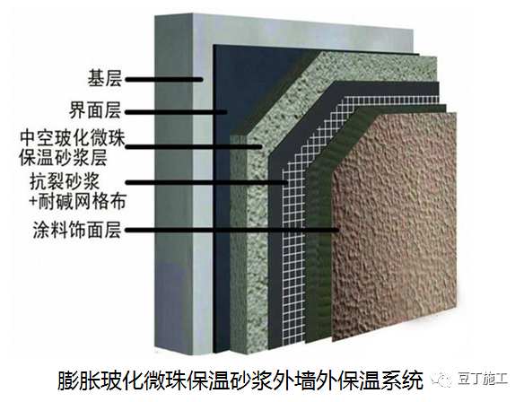 无机轻集料砂浆保温系统是由界面层、无机轻集料保温砂浆保温层、抗裂面层及饰面层组成的保温系统。以憎水型膨胀珍珠岩、膨胀玻化微珠、闭孔珍珠岩、陶砂等无机轻集料为保温材料,以水泥或其他无机胶凝材料为主要胶结料,并掺加高分子聚合物及其他功能性添加剂而制成的建筑保温干混砂浆。本文以膨胀玻化微珠保温材料为例,举例介绍无机轻集料砂浆保温系统的整个施工工艺流程。膨胀玻化微珠保温砂浆系统采用轻质玻化微珠产品,替代传统的普通膨胀珍珠岩和聚苯颗粒作为保温型干混砂浆的轻质骨料的保温砂浆相比,具有保温、抗老化、耐水、不空鼓、不开裂、强度高、粘结性能好、防火强度高,质轻、保温、隔热隔声好,电绝缘性能好,耐磨、耐腐蚀,防辐射等到显著特点。