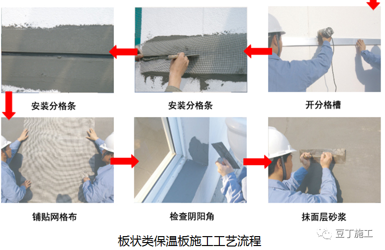 (1)采用的保温材料其性能应符合现行国家标准的规定且已通过当地节能备案,规格厚度、防火等级、安装方式等应满足设计及规范要求并满足当地验收要求,材料均有出厂合格证及性能检测报告。(2)保温粘结砂浆、保温抗裂砂浆均有出厂合格证及性能检测报告。(3)保温锚栓、钢丝网、网格布均有出厂合格证及性能检测报告。(4)饰面材料应符合相应的材料性能要求,还应与外保温系统相兼容。(5)腻子采用弹性腻子,涂料也要求采用弹性涂料并大拉毛处理。在常用外保温体系中主要分为粘贴保温板保温体系及无机轻集料砂浆保温体系两大类,其中粘贴保温板保温体系较多在北方地区使用,保温砂浆较多在南方地区使用,具体施工工艺流程如下:(1)粘贴保温板体系:(按外表形态可分为板状类及棉状类) 1)板状保温材料(适用于改性EPS聚苯板、岩棉复合保温板、发泡水泥板、碳六保温板、聚合硅化改性聚苯板、聚氨酯保温板等)施工工艺流程