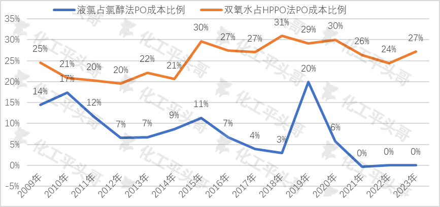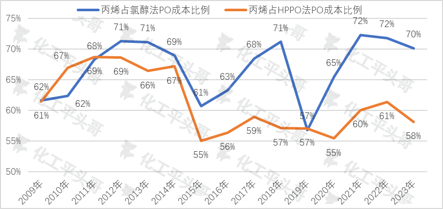 从过去14年中利润波动来看,中国氯醇法和HPPO法环氧丙烷的利润波动存在一致性,但是原料对其利润的影响存在明显的差异性。按照主要原料丙烯在两种不同生产工艺下的环氧丙烷历史成本占比中,可以看到以下规律: