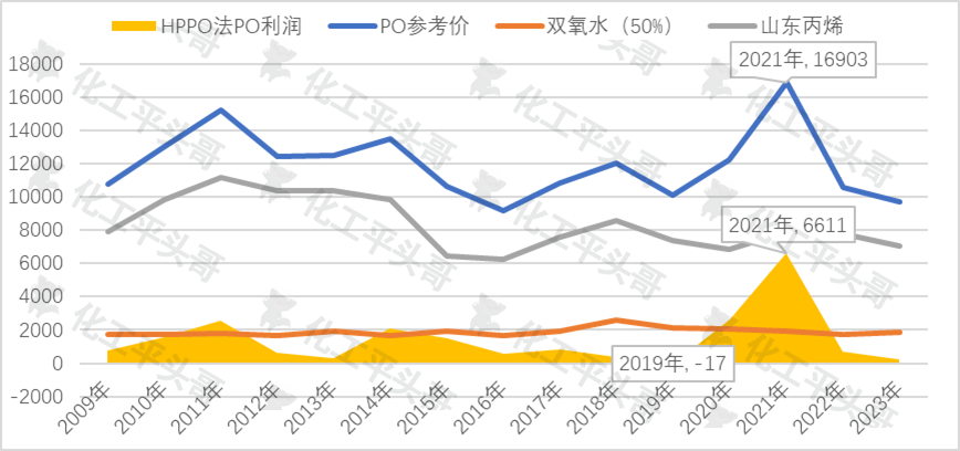 根据从2009年至2023年中旬的价格走势测算来看,过去14年中,中国HPPO法环氧丙烷生产利润波动存在以下规律: