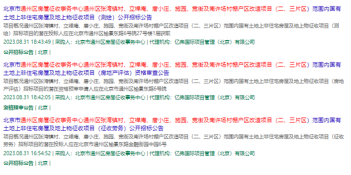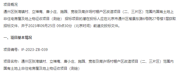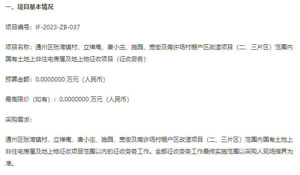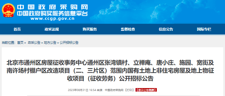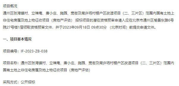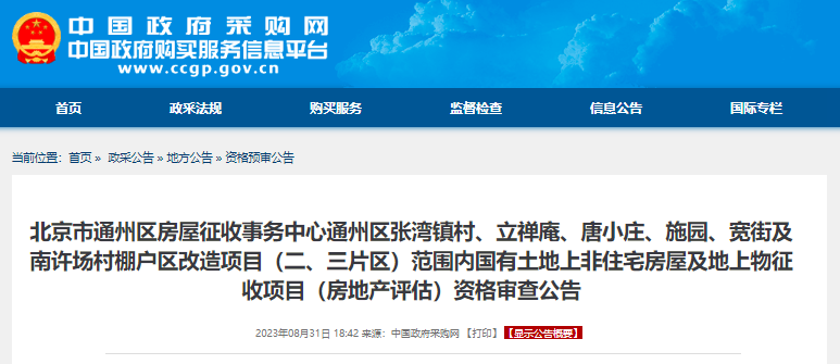 据小编获悉,近日,相关网站发布关于北京市通州区房屋征收事务中心通州区张湾镇村、立禅庵、唐小庄、施园、宽街及南许场村棚户区改造项目(二、三片区)范围内国有土地上非住宅房屋及地上物征收项目(测绘)公开招标公告、房产评估、征收劳务招标公告。