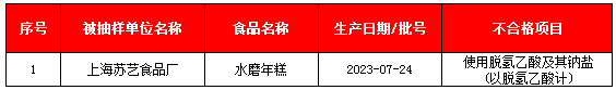 地西泮又名安定,为镇静剂类药物。长期食用检出地西泮的食品,可能引起嗜睡、乏力、记忆力下降等。《食品安全国家标准 食品中兽药最大残留限量》(GB 31650—2019)中规定,地西泮药物允许作食用动物的治疗用,但不得在动物性食品中检出。淡水鱼中检出地西泮的原因,可能是在养殖过程中为快速控制疫病,违规加大用药量,致使上市销售时产品中药物残留量超标;也可能是在运输过程中为了降低新鲜活鱼对外界的感知能力,降低新陈代谢,保证其经过运输后仍然鲜活而违规使用药物。镉(以Cd计)是一种蓄积性的重金属元素。长期食用镉(以Cd计)超标的食品,可能对肾脏、肝脏和骨骼造成损害,还可能影响免疫系统,甚至可能对儿童高级神经活动有损害。噻虫胺、毒死蜱、克百威、啶虫脒均为可使用农药,少量的残留不会引起人体急性中毒,但长期食用相关农残超标食品,对人体健康可能有一定影响。相关农残超标的原因,可能是为快速控制虫害,加大用药量或未遵守采摘间隔期规定,致使上市销售的产品中残留量超标。开展爆浆曲奇(牛奶蛋羹味)等饼干食品监督抽检1批次,经检测合格。开展粉丝等淀粉及淀粉制品食品监督抽检1批次,经检测合格。开展老式面包等糕点食品监督抽检5批次,经检测,全部合格。开展青岛、啤酒、白啤等酒类食品监督抽检40批次,经检测,全部合格。开展三色冰淇淋等冷冻饮品监督抽检44批次,经检测,全部合格。开展水磨年糕、大米等粮食加工品监督抽检42批次,经检测,不合格1批次,合格41批次。脱氢乙酸及其钠盐作为一种广谱食品防腐剂,对霉菌和酵母菌的抑制能力强。脱氢乙酸及其钠盐能被人体完全吸收,并能抑制人体内多种氧化酶,长期过量摄入脱氢乙酸及其钠盐会危害人体健康。脱氢乙酸超标的原因,可能是个别企业为防止食品腐败变质超限量使用了该添加剂,也可能是其使用的复配添加剂中该添加剂含量较高,还可能是在添加过程中未准确计量。