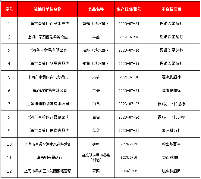 2023年8月,奉贤区食品安全监管部门共检测农产品及食品23866批次。其中检测蔬菜样品23186份,合格率100%;抽检即食食品环节表面、食用农产品、食用油、油脂及其制品等680批次,发现不合格样品18批次,主要为检出大肠菌群、阴离子合成洗涤剂超标、农药残留超标等,合格率为98.13%。区市场监管局已对抽检不合格单位进行调查处理、开展核查处置,追溯源头,进一步督促企业落实主体责任,严把进货关,严控食品安全风险。本月全区胶体金检测蔬菜样品1210份,其中叶菜类样品485份,合格率100%;常规检测蔬菜样品21976份,其中叶菜类样品为11247份。开展即餐盘、碗等餐饮食品监督抽检131批次,经检测,不合格5批次,合格126批次。大肠菌群是指示食品污染状况常用的指标之一。食品中检出大肠菌群,提示被致病菌(如沙门氏菌、志贺氏菌、致病性大肠杆菌)污染的可能性较大。大肠菌群超标的原因,可能是产品所用原料、包装受到污染;也可能是生产加工过程中卫生条件控制不严格。阴离子合成洗涤剂(以十二烷基苯磺酸钠计)主要活性成分是十二烷基苯磺酸钠,是一种低毒的化学物质,是我们日常生活中经常用的洗洁精的主要成分。如果餐饮具清洗消毒流程控制不当,冲洗不足,会造成洗涤剂在餐具上残留,对人体健康可能产生不良影响。国家规定在消毒餐(饮)具中不得检出。开展老姜、牛蛙等食用农产品监督抽检380批次,经检测,不合格12批次,合格368批次。恩诺沙星是一类人工合成的广谱抗菌药,用于治疗动物的皮肤感染、呼吸道感染等,是动物专属用药。长期食用恩诺沙星超标的食品,可能导致在人体中蓄积,进而对人体机能产生危害,还可能使人体产生耐药性菌株。海水鱼中恩诺沙星超标的原因,可能是在养殖过程中为快速控制疫病,违规加大用药量或不遵守休药期规定,致使产品上市销售时的药物残留量超标。