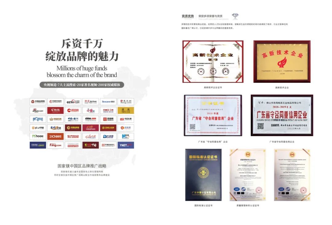 本公司已通过国际GB/T19001-2016 标准管理体系认证,经过十多年不断的发展壮大,固家镁五金现拥有新厂房12000平方米,员工100-120号人,每天产量达到50000-60000余件,荣获《国家高新技术企业》《广东省科技型中小企业》《佛山市专精特新企业》《佛山市规上企业》《知识产权管理体系》《中国著名品牌》《指定环保绿色首选产品》《中国名优产品》《质量 服务 诚信AAA企业》《工程建设推荐产品》《质量信得过产品》《全国消费者放心满意品牌》《广东省重守合同企业》《广东省高新技术产品》等荣誉称号,名列中国品牌产品委员会,中国国际绿色环保管理委员会。本公司技术雄厚,设备齐全,生产工艺比较先进,并注重新产品的应用开发。