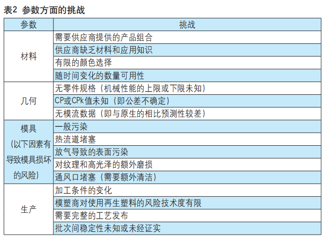 再生塑料的实际性能很可能与感知到的性能与产品参数的所有方面都相关。《指南》总结了每个参数的具体挑战(详见表2)。