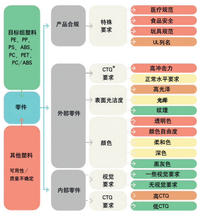 复杂性等级工具是一个流程图,用于说明根据视觉和技术要求以及适用法规将特定零件转化为再生塑料品级的可行性。这为路线图提供了短期(唾手可得的)和更长期(最好的)项目的信息。其中,CTQ=质量关键。此外,医疗产品、食品包装和玩具等特定的材料应用(尚)不适用于再生材料。