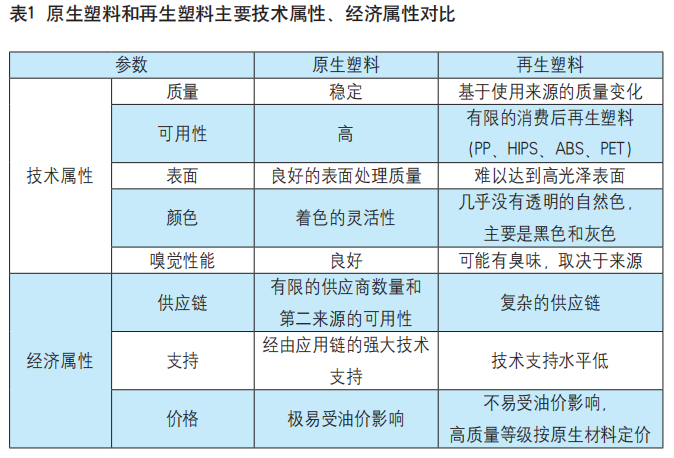 通常而言,再生塑料对于设计者/制造商是新事物,因此实现预期结果是一条充满不确定性的道路。知识、经验的缺乏和风险的增加是产品使用更多再生塑料的主要障碍。为此,《指南》对原生塑料和再生塑料的主要技术属性和经济属性进行了比较(见表1)。