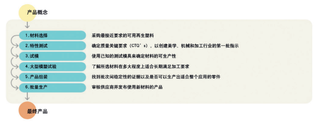 成本、可用性、颜色稳定性、批次间稳定性和工艺能力等不确定性需要降至最低,以证明再生材料符合商业案例和产品的技术需求。只有采取这些步骤后,设计者/制造商才有可能走向大型模具试验、产品组装,并最终进行产品的批量生产。