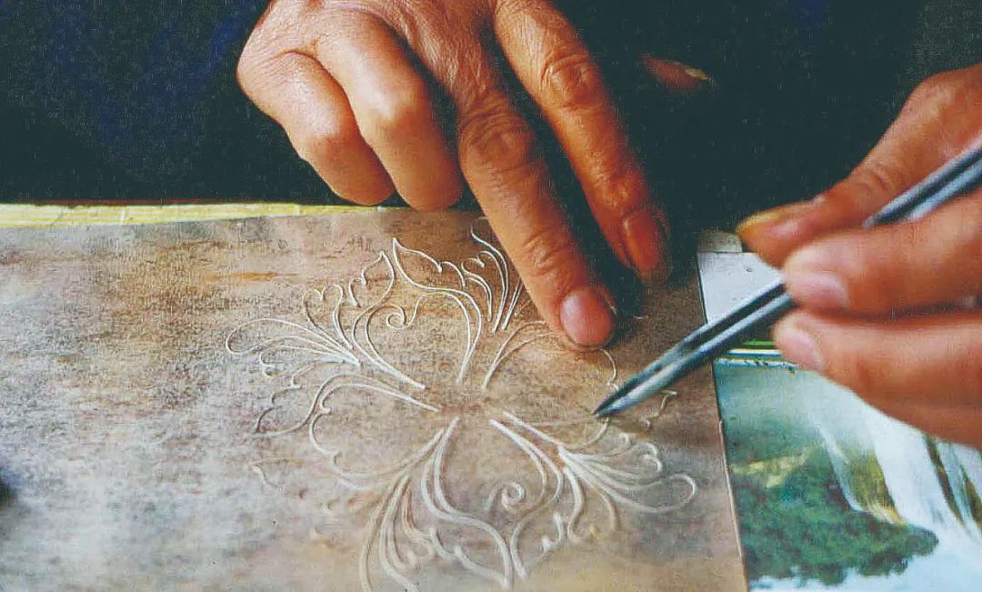 简单说来,花丝工艺需要经过搓丝、掐丝和焊丝几个步骤。搓丝就是将纯度较高、直径约为0.3毫米的细银丝适当压扁,然后在头端拧几个小麻花,再将其放在自制的“花丝木”(两块木质很硬的光滑木头,因专用于搓花丝而得名)上,均匀地搓成麻花状的细丝——麻花越紧密、越流畅就越是精品。掐丝则是用镊子掐出细小的纹样来,流畅、完整的纹样是作品具有较高审美性的保障。焊丝就是将花丝焊接在银片上,这是最难做也是最关键的一步。说它难,是因为焊接时火候不容易控制,如果火力太小,花丝就不能全部焊在银片上,如果火力太重,花丝就会被烧化,而如果焊的次数太多,银片上就会出现被烧坏的小坑。