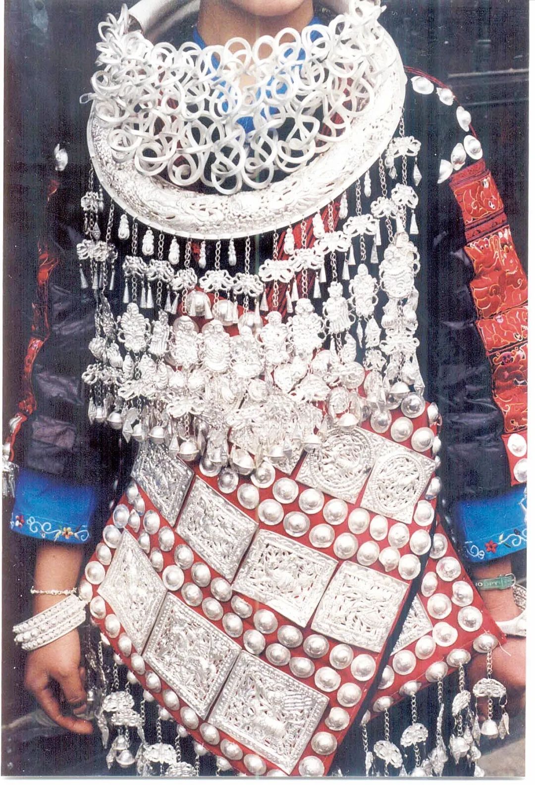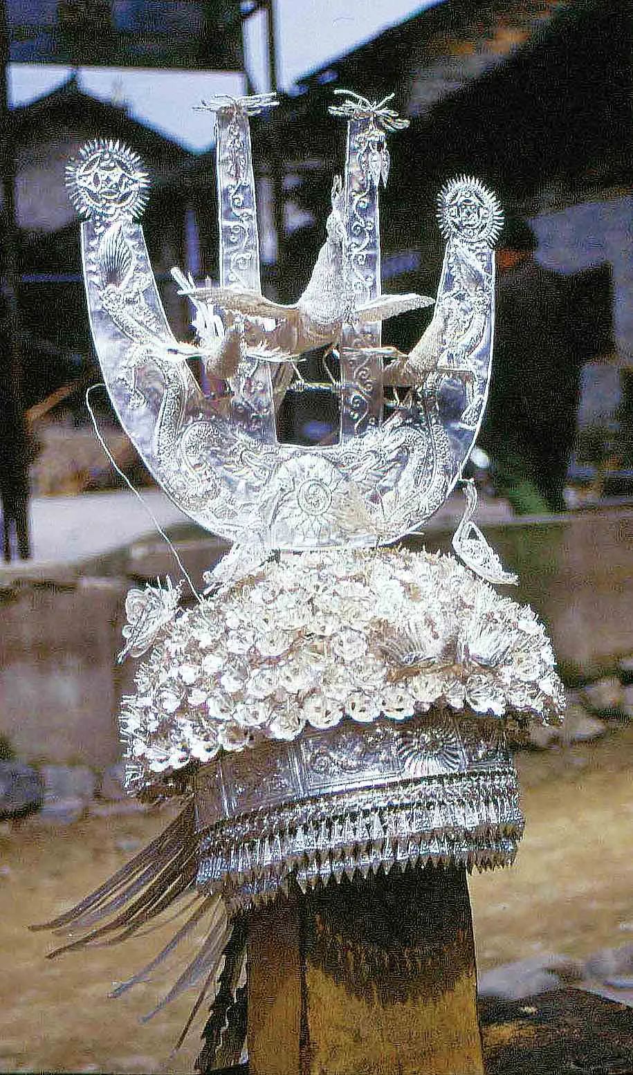 我国苗族佩戴银饰的历史非常悠久。据史籍记述,战国秦汉时期,包括苗族先民在内的南方濮僚系统大量使用铜饰,魏晋以后衍化为银饰,至唐贞观年间,贵州“东谢”苗族入中原朝见时已是“以金银络额”。在宋代,苗族大量使用银饰,妇女“耳戴大环,项戴银圈自一二围至十余围”,或“以银锡为钗”。明代,苗族“富者以金银耳环”为饰,“喜戴银圈”。清代,苗族银饰更进入兴盛时期,在很多地区,宋明时期的“大耳环”演变为纤巧玲珑的珠式耳环,项圈项链制作考究,并出现精致的银冠、银衣等高档品,现今的苗族银饰款式,大都是清代的定型化遗承。