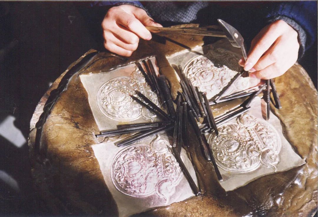 银帽冠的制作工艺非常复杂,即使是熟练的银匠师傅,也需要花费两个月的工时完成。银帽冠主要使用錾刻工艺和花丝工艺,其中,帽顶装饰物主要采用花丝工艺。